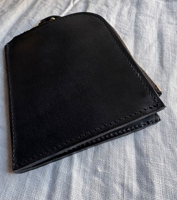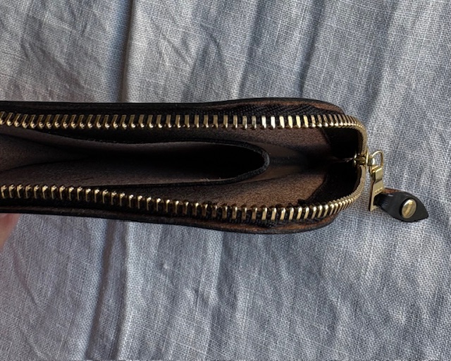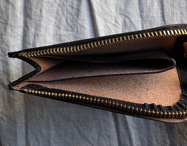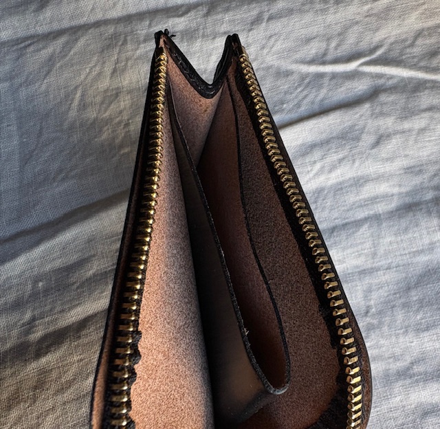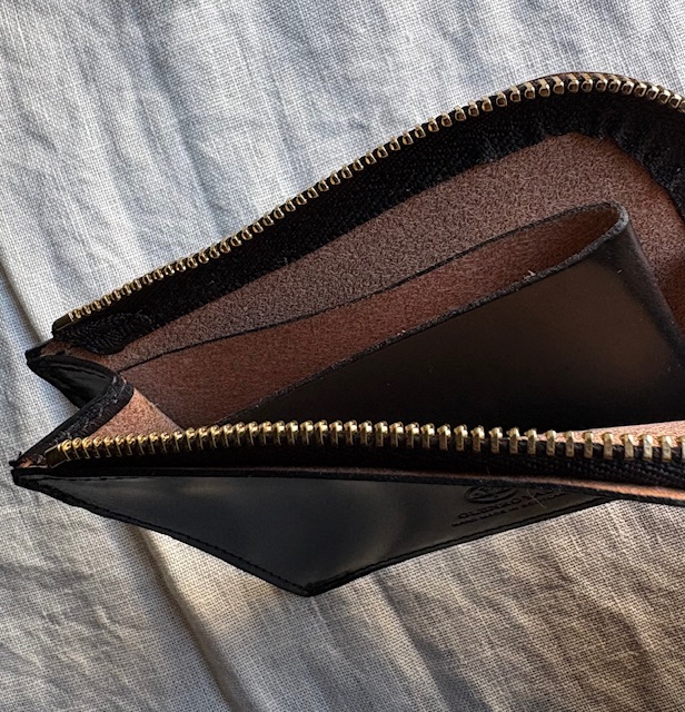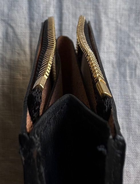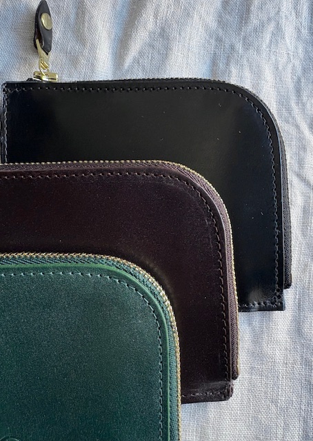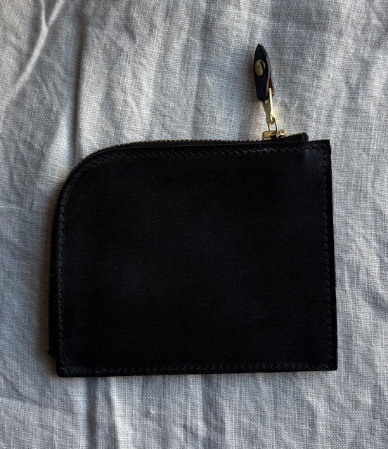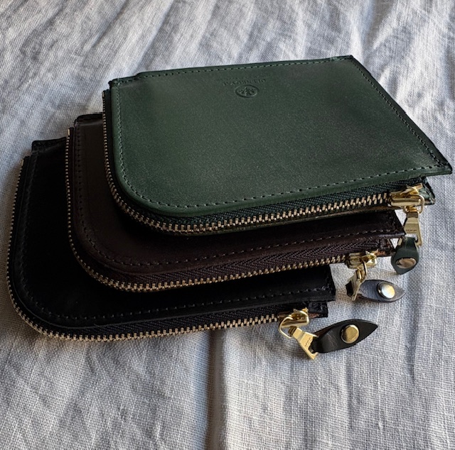 作りはごくごくシンプル。ジッパーを開くと真ん中にレザーを折り返した簡単な小銭のスペース。それを仕切りとして左右にカードや二つ折りにしたお札を収納できるスペースとなります。お財布というよりは、小銭もお札も入れられるカードケース、またはカードもお札も入れられる小銭入れといったお品物ですが、最小限必要なものをが入れられ、シンプルな構造だけにとても使いまわしのよいプロダクトになっています。カラーはブラック、シガーという濃いブラウン、深みのある落ち着いたグリーンです。